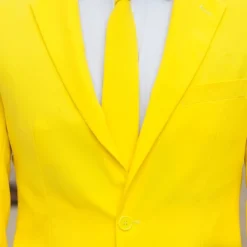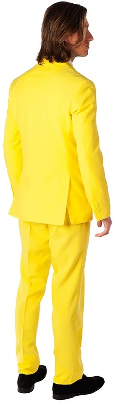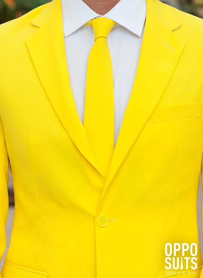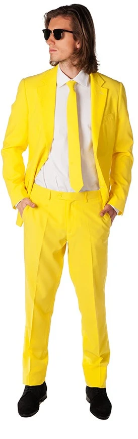 Overal waar jij komt verlicht de ruimte met dit gave maatpak! Dit kostuum genaamd de Yellow Fellow is zo geel dat je er een zonnebril voor op moet zetten.