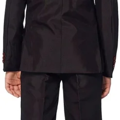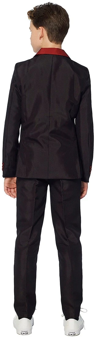 broek is zwart en de stropdas rood met goudkleurige strepen.