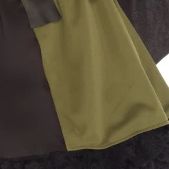 Details: jurk met capuchon en gespen op de voorkant. Een asymmetrische cape met één schouder en een riem met daaraan een geld buideltje