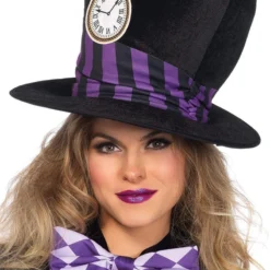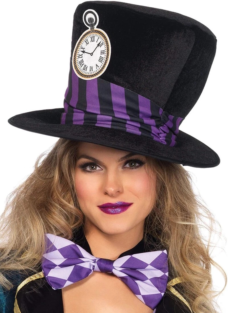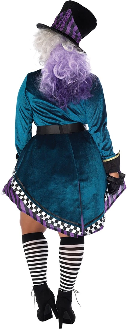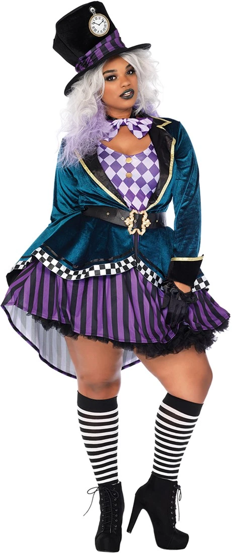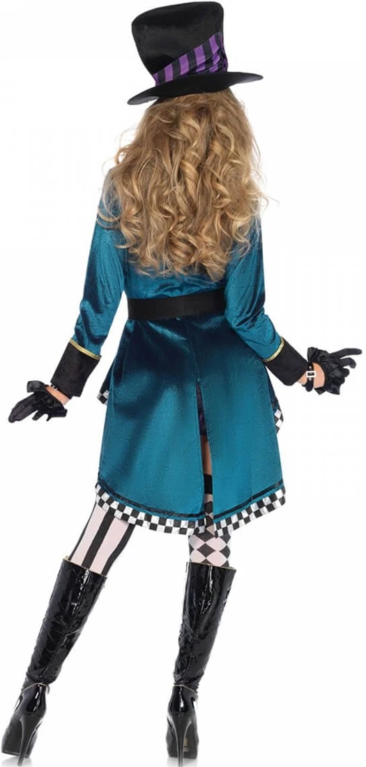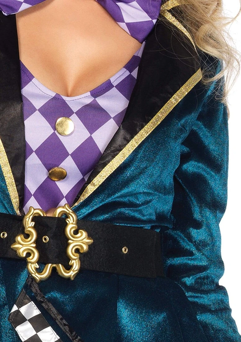 Details: fluwelen jasjurk met meerdere prints en een vast vest, een bijpassende vlinderdas, een riem en een heerlijke gekke hoedenmuts met klokdetail.