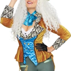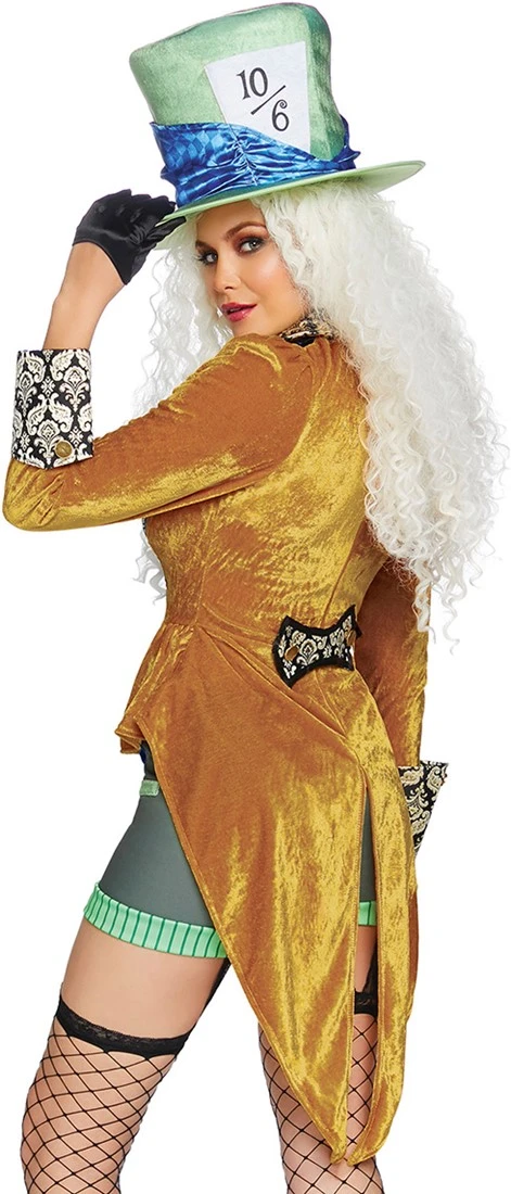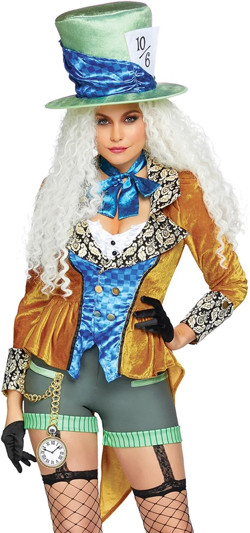 Details: fluwelen jas met brokaat accent, een korte broek met geborduurd zakhorloge, een glimmende stropdas/strik en de iconische gekke hoed