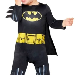 Details: jumpsuit met vleermuis logo. De cape is makkelijk te bevestigen met klittenband