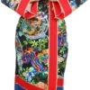 Details: de randen van het jurkje zijn afgewerkt met zwart band en rechts bovenin zitten ter decoratie 2 knoopjes
