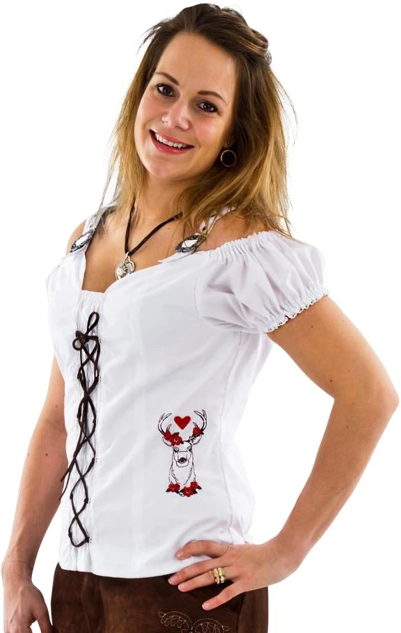 Een mooie Tiroler blouse met een opdruk van een hert met een hart en bloemen. De blouse heeft aan de voorzijde een zwarte strik zitten en is ideaal om boven lederhosen aan te hebben.