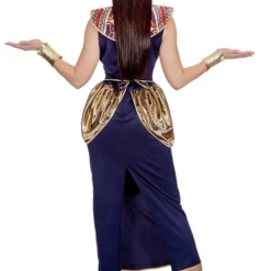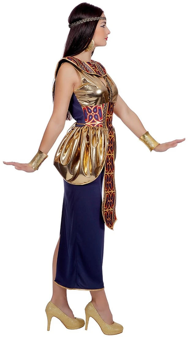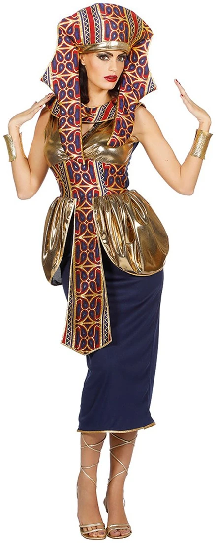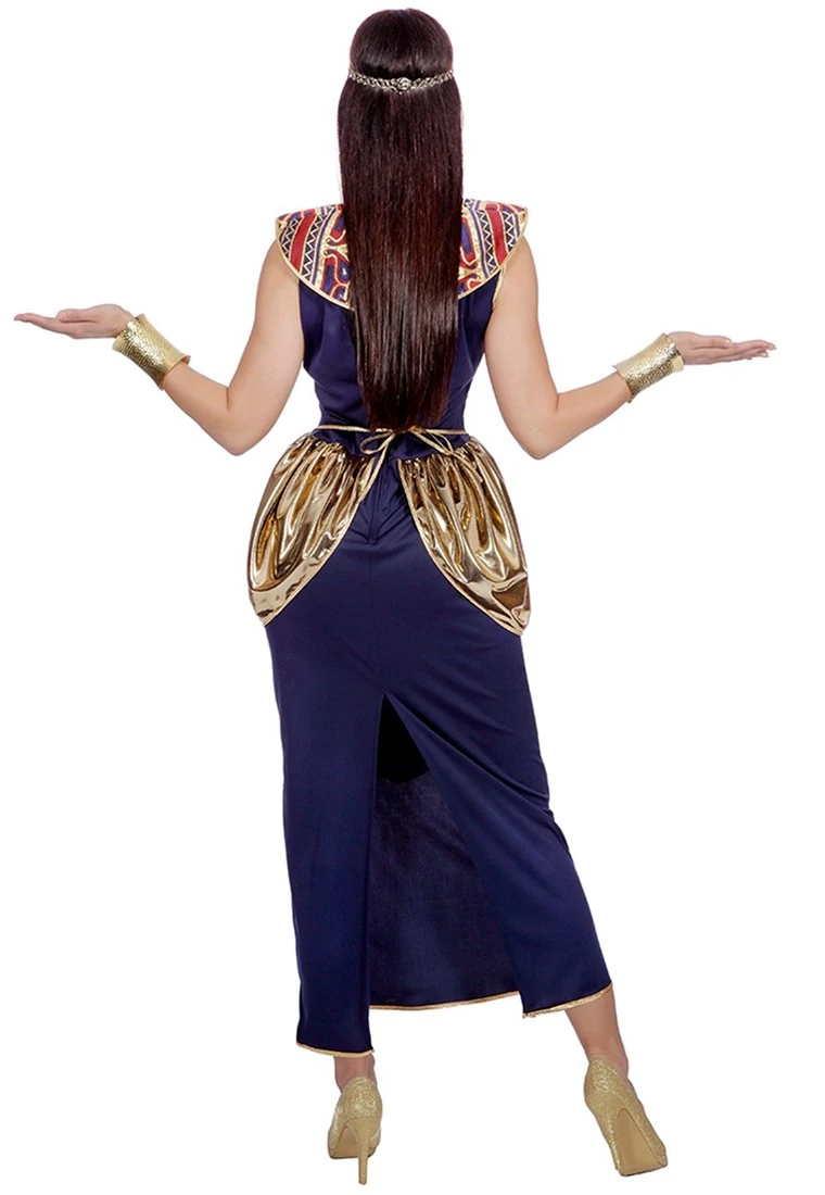 Een mooi kostuum voor een Egyptisch feest! De donker blauwe jurk is gemaakt van een fijne stof en afgewerkt met een mooi patroon en gouden details!