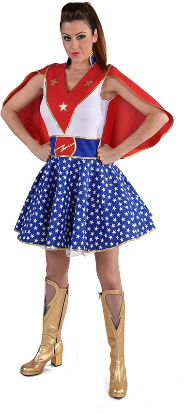 In dit leuke kostuum kun jij verkleed als Super Girl! Het kostuum heeft de bekende USA kleuren en sterren met gouden details. Het jurkje wordt geleverd exclusief de laarzen.