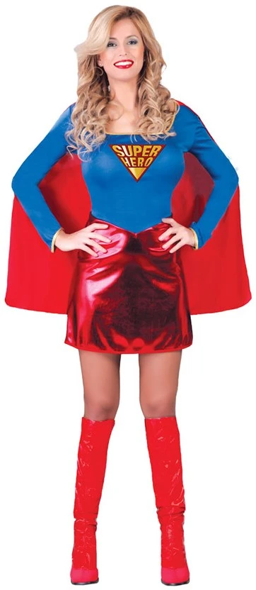 Een gaaf jurkje dat gebaseerd is op Super- of Wonderwoman! Een heel leuk kostuum dat eendelig is en bestaat uit het jurkje met een cape.