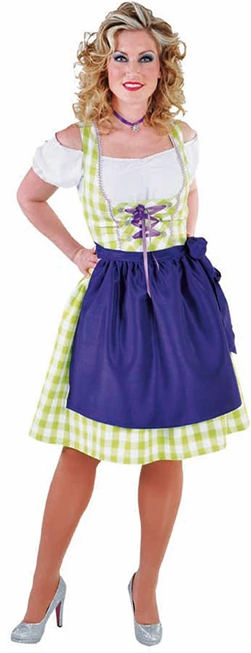 Deze dirndl bestaat uit een rok, een blouse en een schortje. Verkrijgbaar in drie verschillende kleuren.