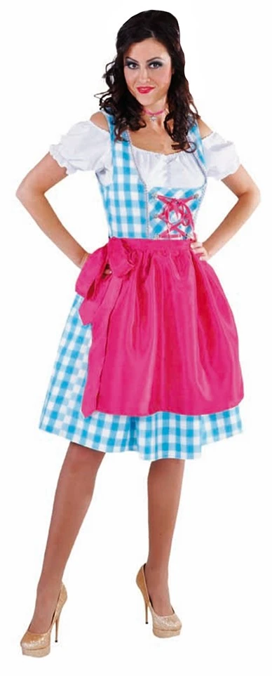 Dit dirndl jurkje bestaat uit een jurk, blouse, en schortje. Verkrijgbaar in 3 verschillende kleuren.