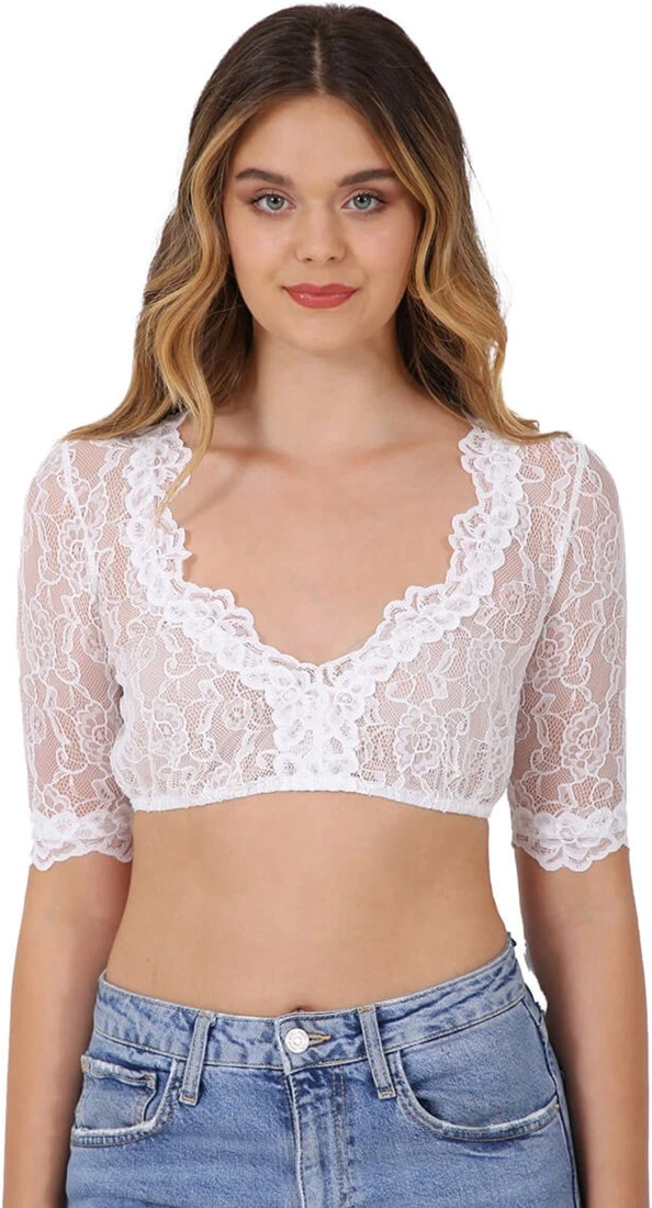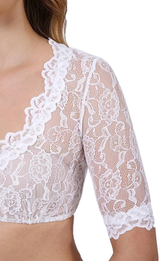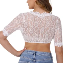 Details: transparant kant met versieringen op de V halslijn om het decolleté benadrukken en half lange mouwen