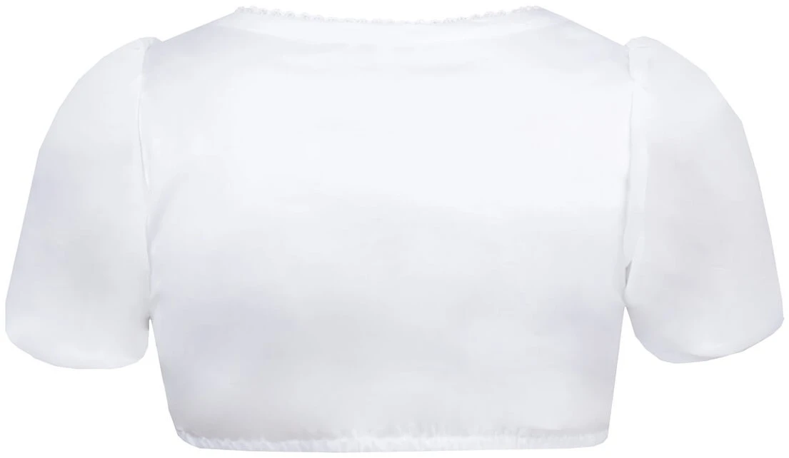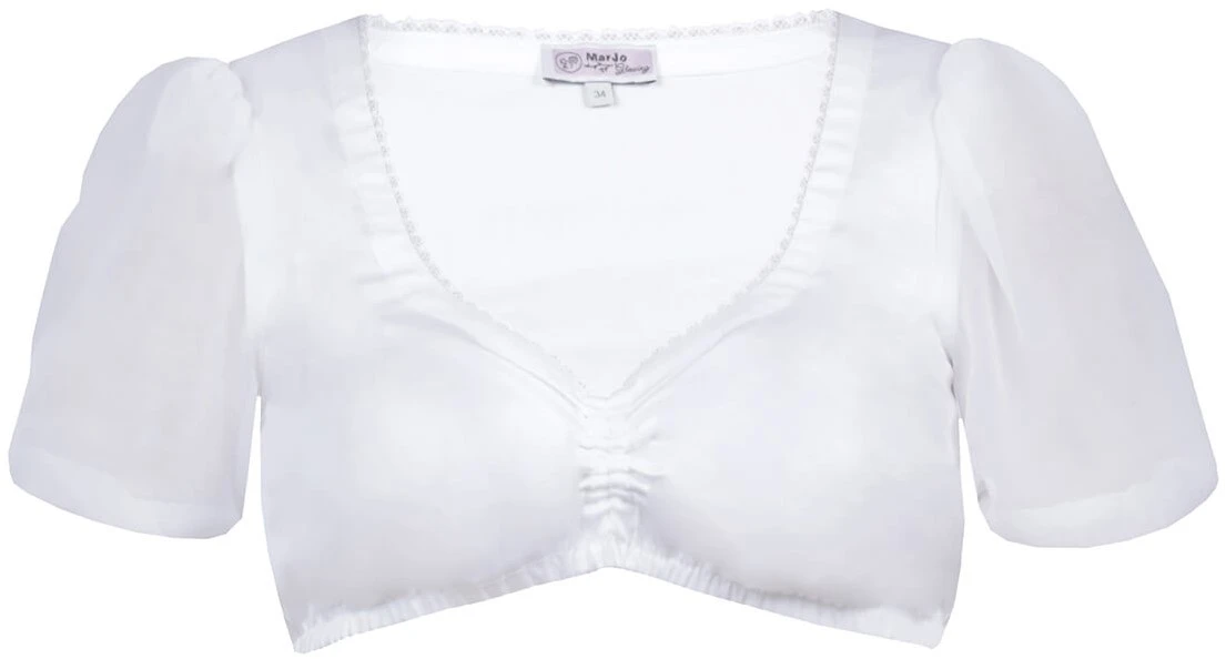 Details: hartvormige halslijn met een klein kanten randje en doorzichtige pofmouwen