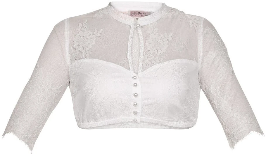 Details: half lange mouwen, kleine opstaande kraag die overgaat in een druppelvormige halslijn. Het borstgedeelte is ondoorzichtig en afgewerkt met parel knoopjes