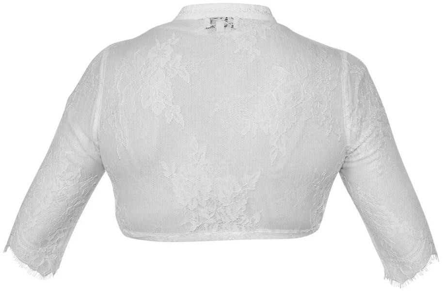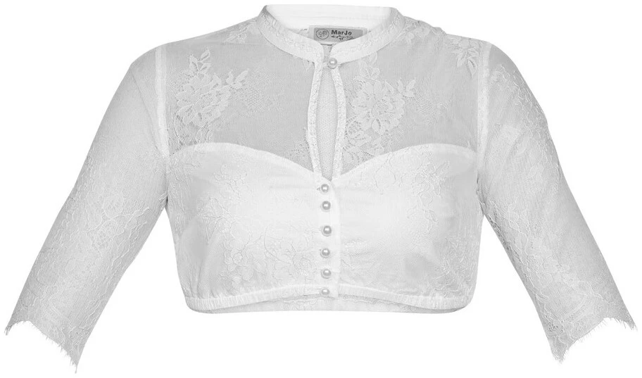 Details: half lange mouwen, kleine opstaande kraag die overgaat in een druppelvormige halslijn. Het borstgedeelte is ondoorzichtig en afgewerkt met parel knoopjes