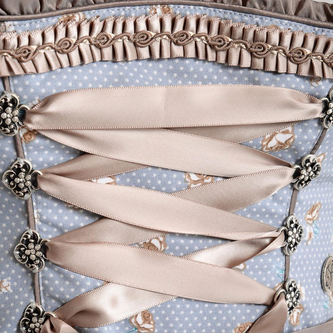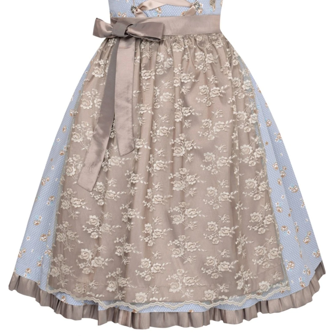 Patroon: De jurk licht blauw met witte stippen en koper kleurige roosjes. In kanten laagje voor het schort zijn roosjes verwerkt.