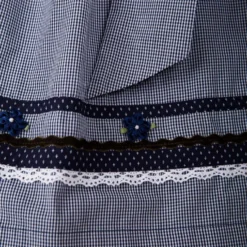 Patroon: een blauw/wit ÷ motiefje en een motief van witte lijnen op het schort