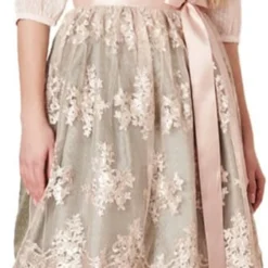 Details dirndl: uitgebreide randen langs een rechte halslijn en lijfhaakjes met strass