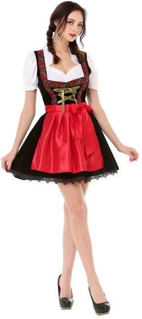 Details: bewerkt galon op de borst, rood schort en de rok is afgewerkt met zwart kant