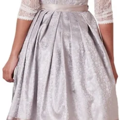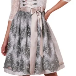 Details dirndl: uitgebreide randen langs een hartvormige halslijn en miederhaakjes met parels