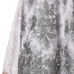 Details schort: 2 lagen, de bovenlaag is transparant met bloemen borduurwerk, parels en studs