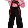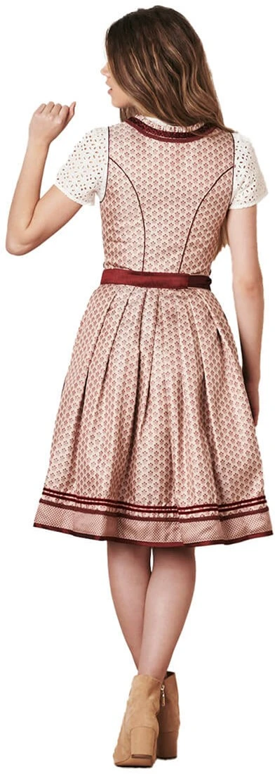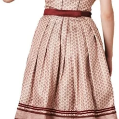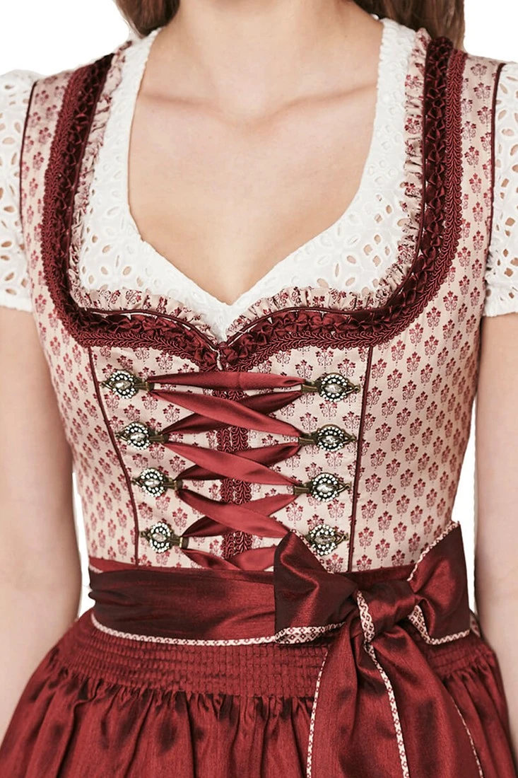 Details dirndl: hartvormige halslijn versierd met ruches, miederhaakjes met strass en steentje en een satijnen lint