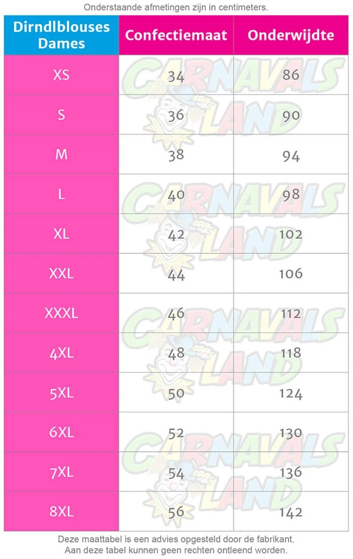 | Dames confectie | 34 = XS, 36 = S, 38 = M, 40 = L, 42 = XL, 44 = XXL, 46 = 3XL, 48 = 4XL + EUR 2,00, 50 = 5XL + EUR 2,00, 52 = 6XL + EUR 2,00, 54 = 7XL + EUR 2,00, 56 = 8XL + EUR 2,00, 58 = 9XL + EUR 2,00, 60 = 10XL + EUR 2,00 |