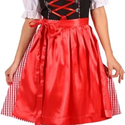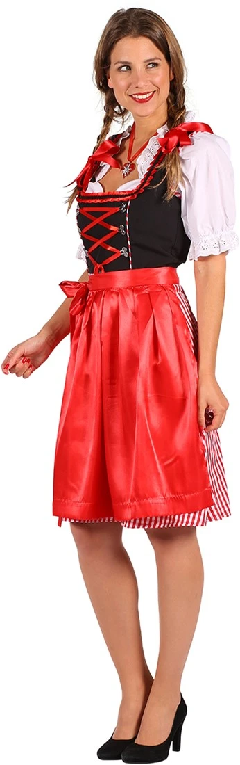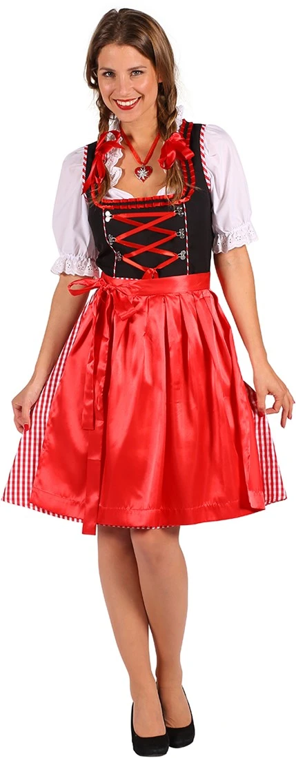 Deze leuke dirndl heeft een zwarte/rood kleurenpatroon, met een zwarte bovenkant en rood/wit geblokte rok. Onder het decollete zitten metalen gepen met daardoorheen een rood lint. Daarboven en bij de hals is de jurk afgewerkt met een sierlijke satijnen band. Het rode schort is van satijn en maakt de dirndl helemaal compleet. De witte dirndlblouse is aan de randen afgewerkt met een soort van kant.