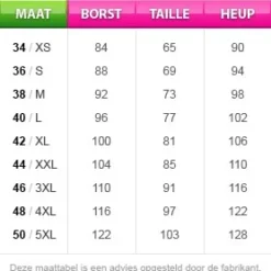 | Dames confectie | 36 = S, 38 = M, 40 = L, 42 = XL, 44 = XXL, 46 = 3XL, 48 = 4XL |