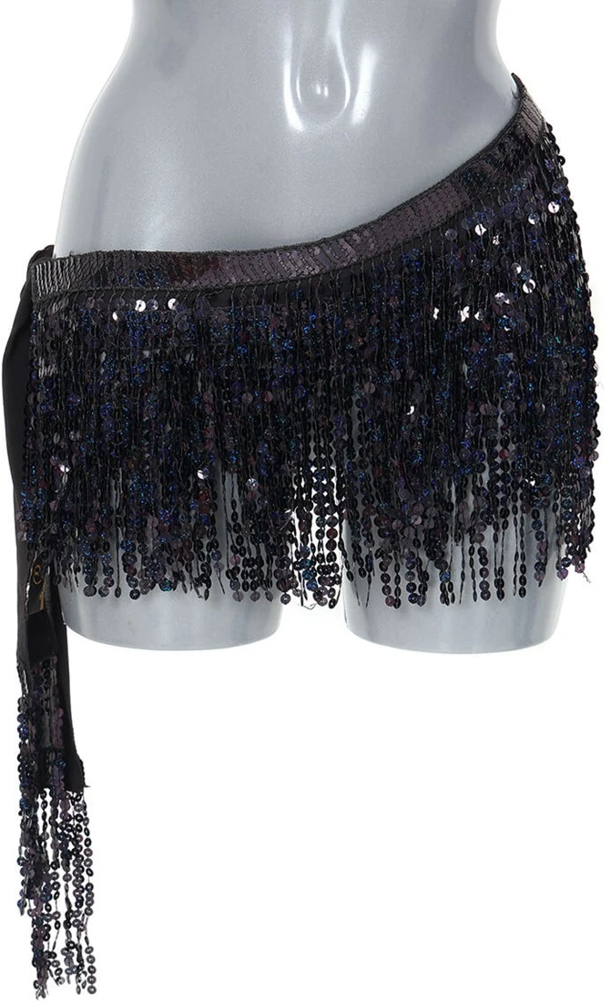 Details: de rand aan de bovenkant en de franjes zijn versierd met zwart holografische pailletten