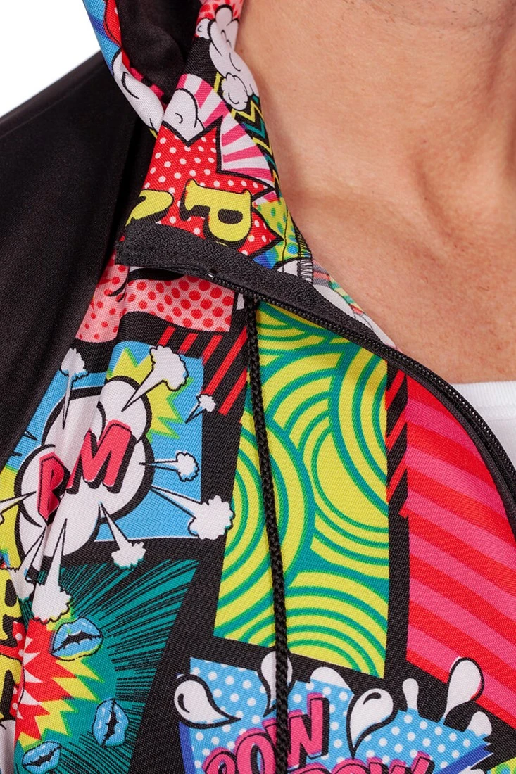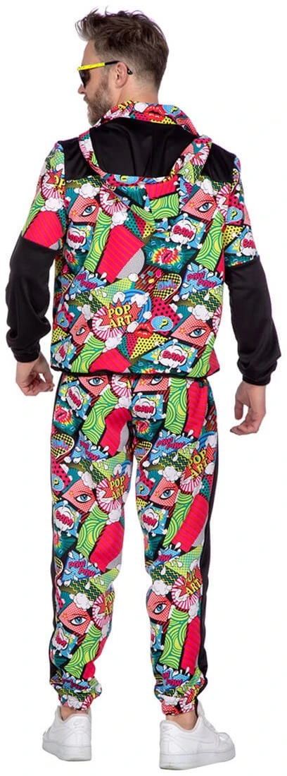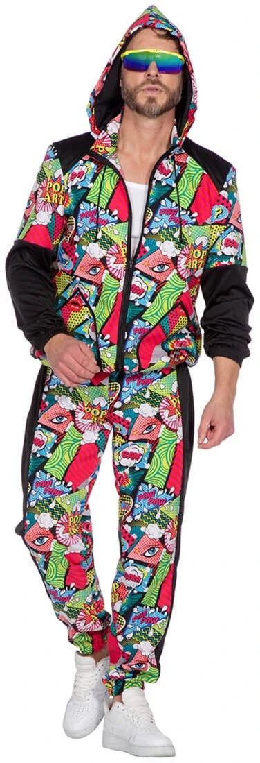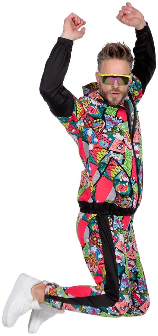 Dit hippe trainingspak met hoodie is de perfecte outfit voor jouw foute party of 80’s of 90’s feest. Ook tijdens een Kamping Kitsch festival kom je met deze Pop Art print opvallend goed voor de dag.