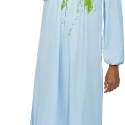 Details: aan de kraag en onderkant zit een bloemen motief, en voorop de japon een spoor van braaksel