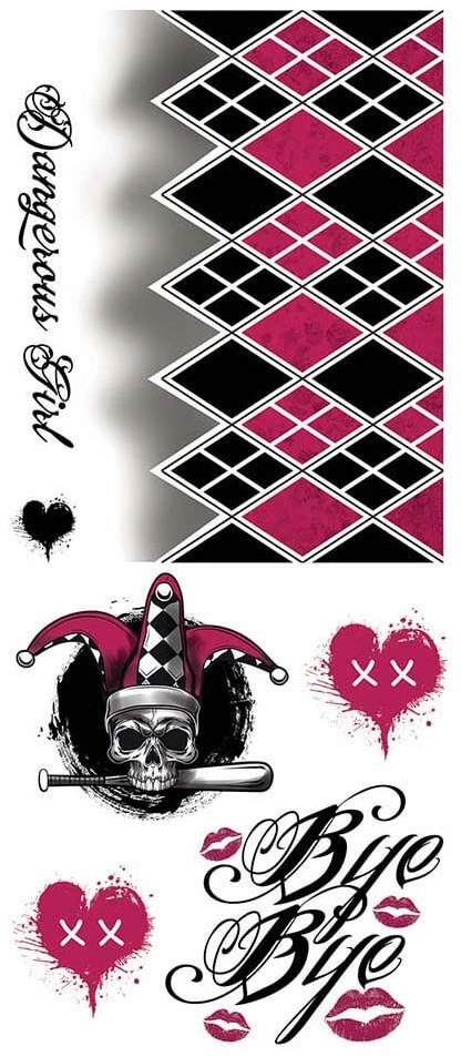 Afbeelding: hartjes, lippen, ruiten patroon, schedel met narren muts en baseball knuppel