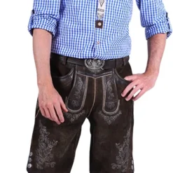 Een prachtige donkerbruine lederhose voor heren met mooie traditionele 3D sticksels. Perfect voor ieder Oktoberfest.