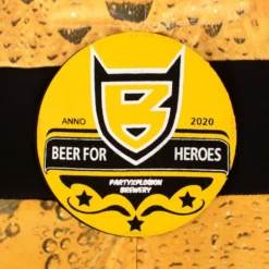 Details overall: voorgevormde spierbundel met de letter B op de borst, aan de armen oren van een bierglas.