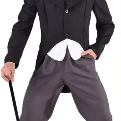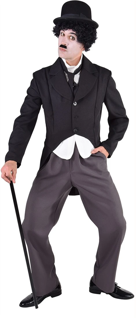 Ga verkleed als Charlie Chaplin in dit 3 delige retro kostuum. Het witte vest is vastgenaait aan het colbert (te sluiten met knopen). Het pak is gemaakt van 100% polyester.