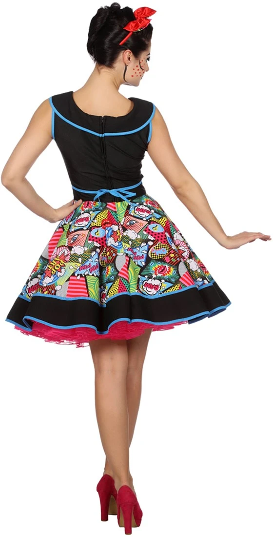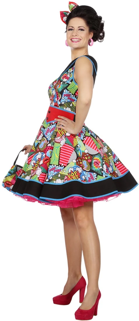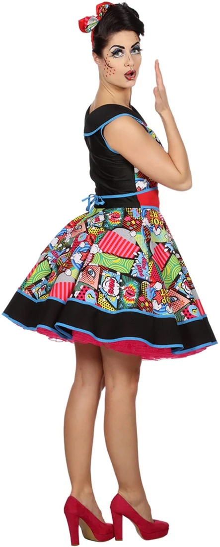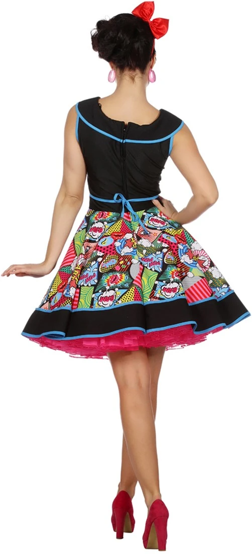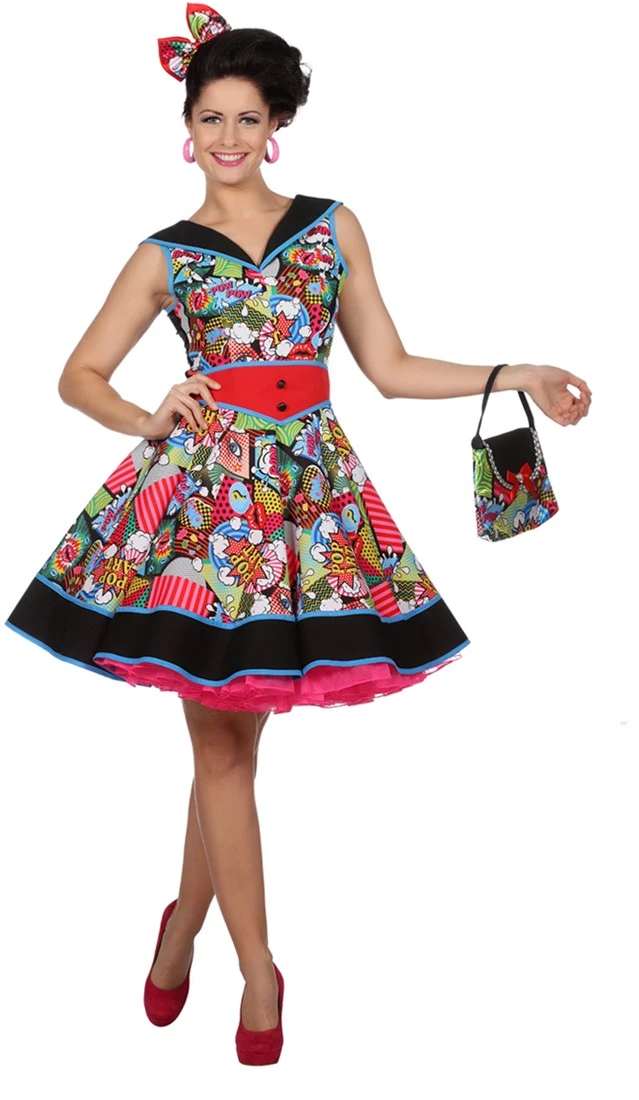 Met dit kleurrijke jurkje trek jij zeker wel de aandacht! Het jurkje is in stijl van de Pop Art uit de jaren 50 met knipselkrant figuren . Met de verschillende teksten en afbeeldingen val jij wel op tussen alle partygangers.