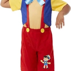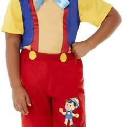 Details: geel shirt met vast gilet en bretels, rood broekje met een afbeelding van pinokkio erop