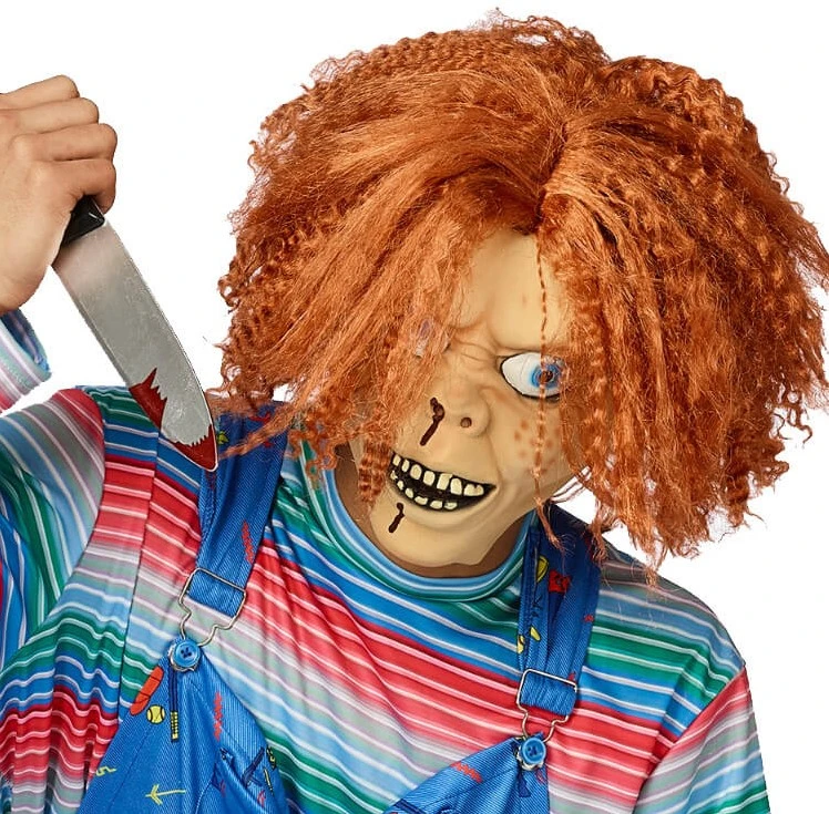 Een eng masker dat duidelijk geinspireerd is op Chucky uit de films Child’s Play. Het creepy masker is gemaakt van dunne latex en heeft lang rood haar. Voorzien van kijkgaten bij de ogen en gaten bij de neus en mond. Dit griezelige masker trek je over je hele hoofd heen.