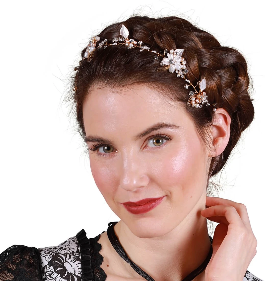 Details: de haarband is versierd met parels en bloemen