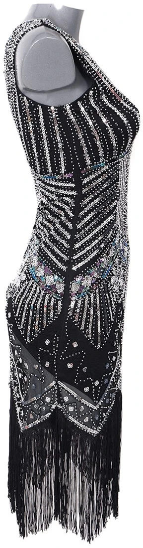 Kenmerken: de jurk is met pailletten en kraaltjes versierd. Onderaan de jurk hangen zwarte franjes