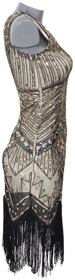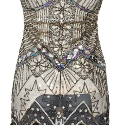 Details: een onderjurkje met daarover heen een doorzichtige jurk die bewerkt is met pailletten, kraaltjes en onderaan franjes