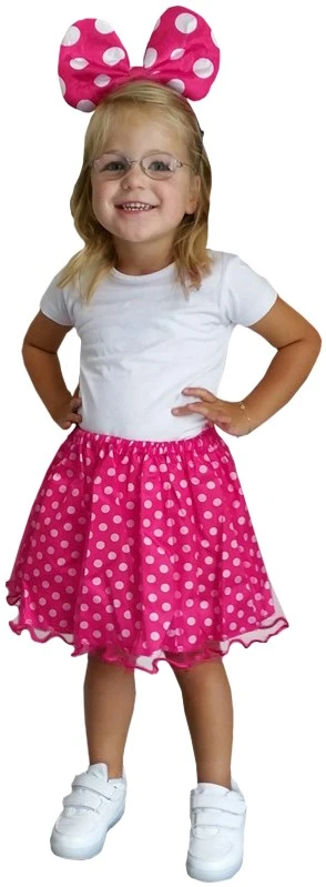 Ga verkleed als Minnie Mouse met dit leuke felroze/witte setje van rokje en diadeem met oortjes. Het rokje heeft een elastische band waardoor het geschikt is voor maat 104 t/m 152.