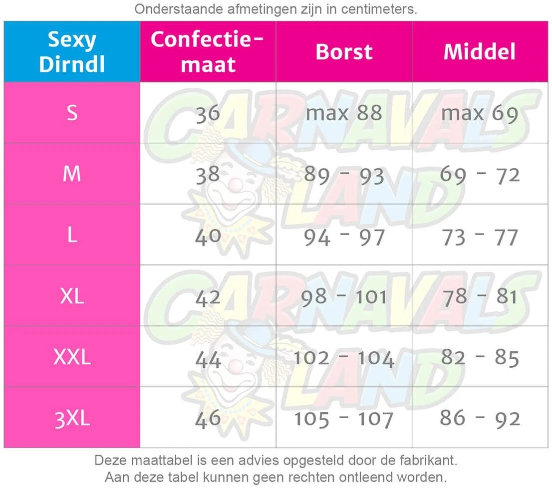 | Dames confectie | 38 = M, 40 = L, 42 = XL, 44 = XXL, 46 = 3XL |