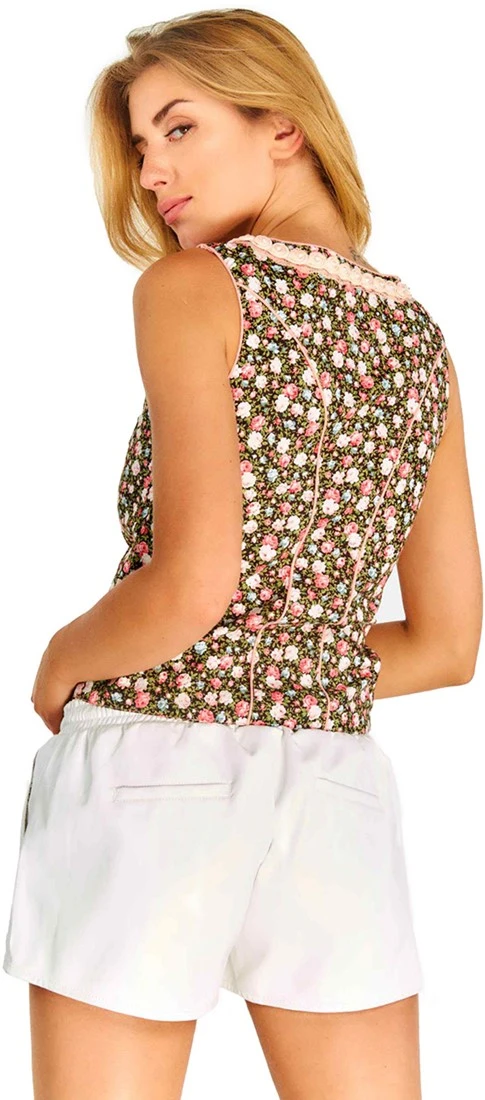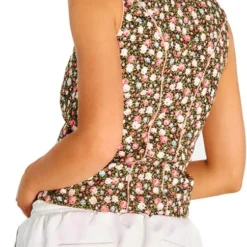 Een mooie en kwalitatief goede Trachtenmieder met een roosjes patroon en afgewerkt met zalm roze details. De mieder kan mooi gedragen worden oner een lederhose of een Tiroler Jeans!