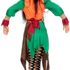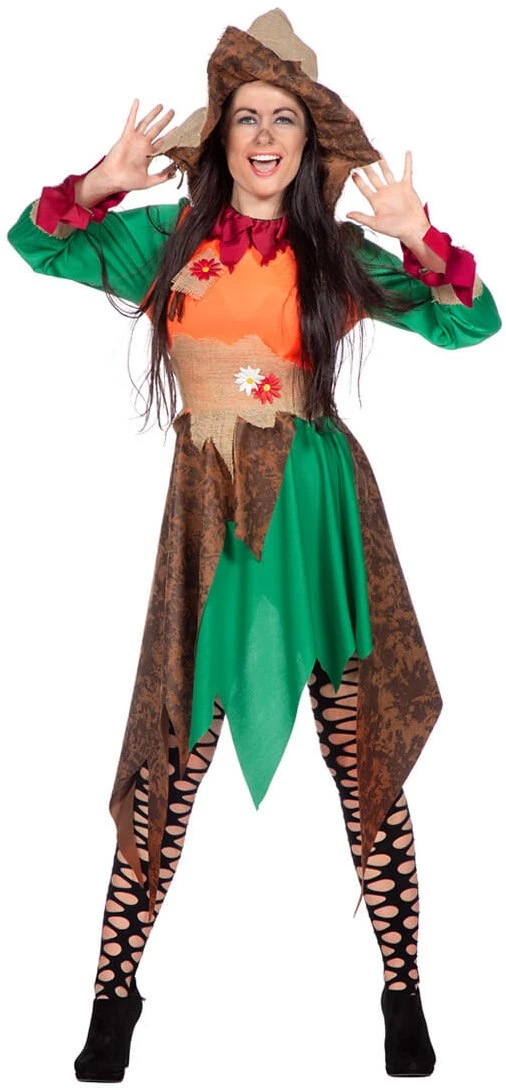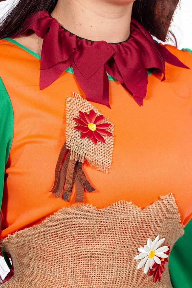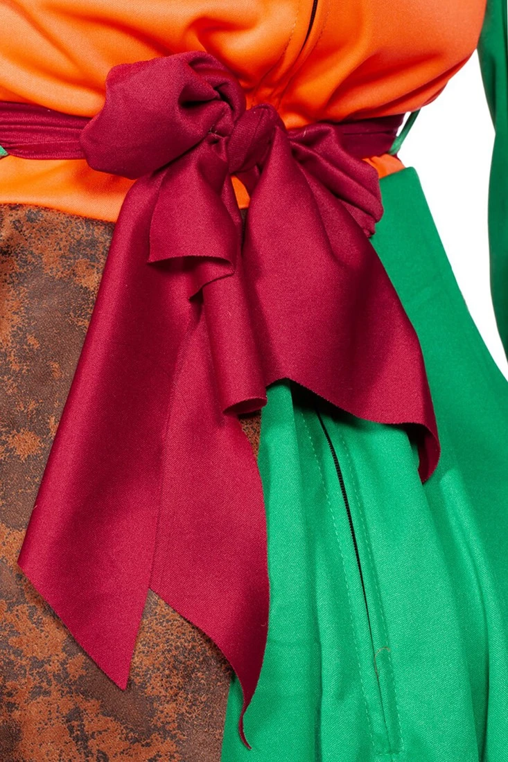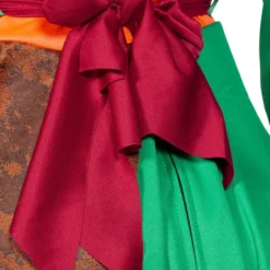 Detail jurk: verschillende kleuren en prints met op de buik en borst bloemen